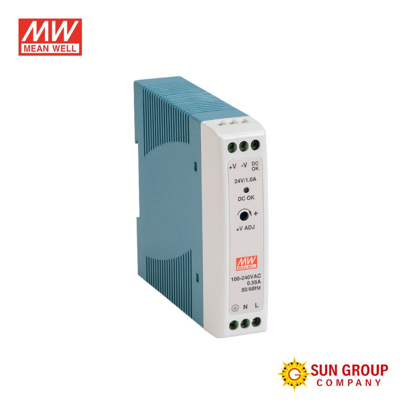 La fuente de alimentación MDR-20-24 es una unidad de montaje en carril DIN de 24W que ofrece una tensión de salida de 24Vcc (1A) con una entrada universal de 85-264Vca. Sus principales características incluyen una alta eficiencia del 84%, un bajo consumo en vacío de menos de 0.75W, protecciones contra cortocircuito, sobrecarga y sobretensión, y un rango de temperatura de operación de -20°C a 70°C.